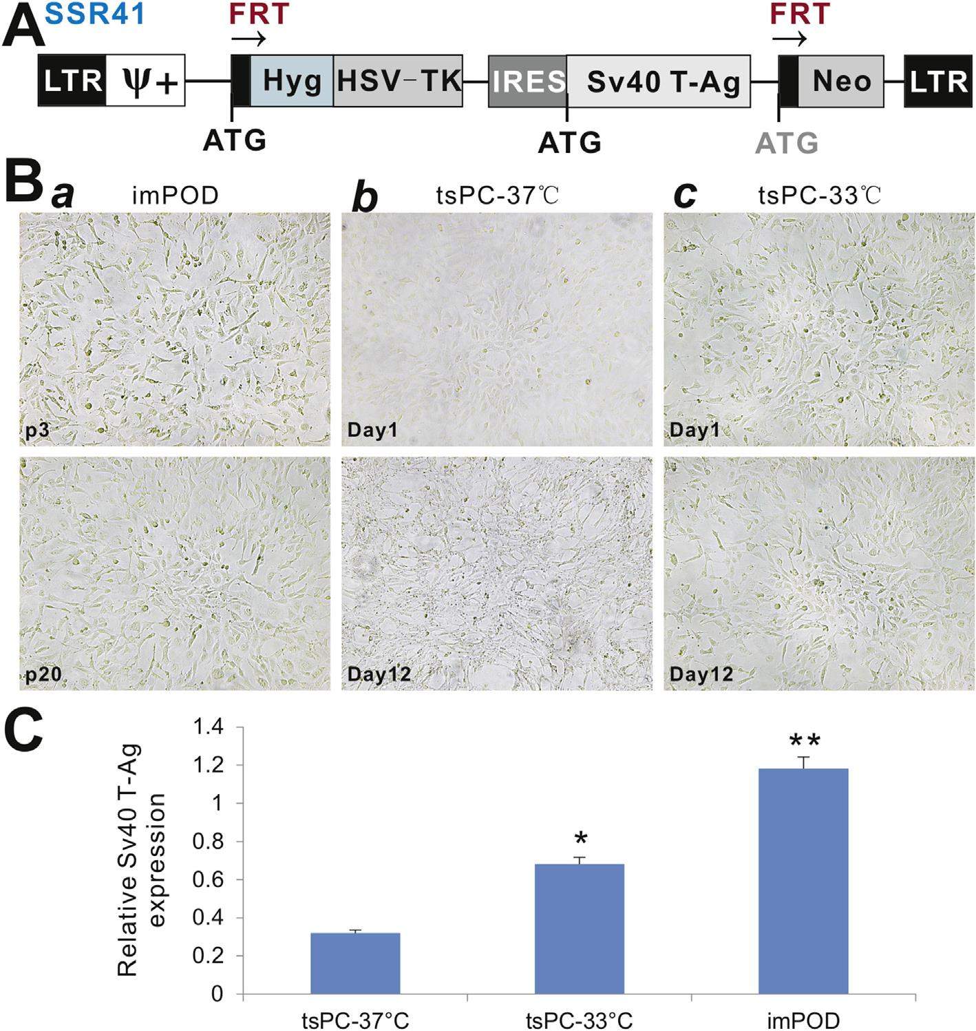 Glomerular podocytes are highly specialized epithelial cells and play an essential role in establishing the selective permeability of the glomerular filtration barrier of kidney. Maintaining the viability and structural integrity of podocytes is critical to the clinical management of glomerular diseases, which requires a thorough understanding of podocyte cell biology. As mature podocytes lose proliferative capacity, a conditionally SV40 mutant tsA58-immortalized mouse podocyte line (designated as tsPC) was established from the Immortomouse over 20 years ago. However, the utility of the tsPC cells is hampered by the practical inconvenience of culturing these cells. In this study, we establish a user-friendly and reversibly-immortalized mouse podocyte line (designated as imPOD), on the basis of the tsPC cells by stably expressing the wildtype SV40 T-antigen, which is flanked with FRT sites. We show the imPOD cells exhibit long-term high proliferative activity, which can be effectively reversed by FLP recombinase. The imPOD cells express most podocyte-related markers, including WT-1, Nephrin, Tubulin and Vinculin, but not differentiation marker Synaptopodin. The imPOD cells do not form tumor-like masses in vivo. We further demonstrate that TGFβ1 induces a podocyte injury-like response in the FLP-reverted imPOD cells by suppressing the expression of slit diaphragm-associated proteins P-Cadherin and ZO-1 and upregulating the expression of mesenchymal markers, α-SMA, Vimentin and Nestin, as well as fibrogenic factors CTGF and Col1a1. Collectively, our results strongly demonstrate that the newly engineered im-POD cells should be a valuable tool to study podocyte biology both under normal and under pathological conditions.