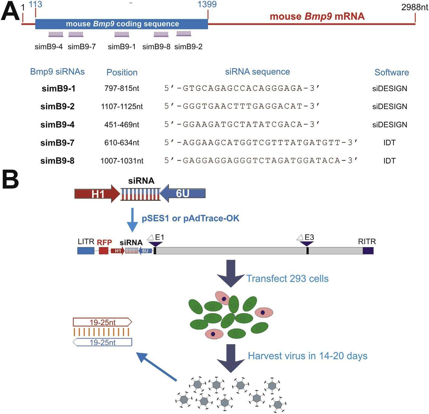 Mesenchymal stem cells (MSCs) are multipotent stem cells and capable of differentiating into multiple cell types including osteoblastic, chondrogenic and adipogenic lineages. We previously identified BMP9 as one of the most potent BMPs that induce osteoblastic differentiation of MSCs although exact molecular mechanism through which BMP9 regulates osteogenic differentiation remains to be fully understood. Here, we seek to develop a recombinant adenovirus system to optimally silence mouse BMP9 and then characterize the important role of BMP9 in osteogenic differentiation of MSCs. Using two different siRNA bio-informatic prediction programs, we design five siRNAs targeting mouse BMP9 (or simB9), which are expressed under the control of the converging H1 and U6 promoters in recombinant adenovirus vectors. We demonstrate that two of the five siRNAs, simB9-4 and simB9-7, exhibit the highest efficiency on silencing exogenous mouse BMP9 in MSCs. Furthermore, simB9-4 and simB9-7 act synergistically in inhibiting BMP9-induced expression of osteogenic markers, matrix mineralization and ectopic bone formation from MSCs. Thus, our findings demonstrate the important role of BMP9 in osteogenic differentiation of MSCs. The characterized simB9 siRNAs may be used as an important tool to investigate the molecular mechanism behind BMP9 osteogenic signaling. Our results also indicate that recombinant adenovirus-mediated expression of siRNAs is efficient and sustained, and thus may be used as an effective delivery vehicle of siRNA therapeutics.